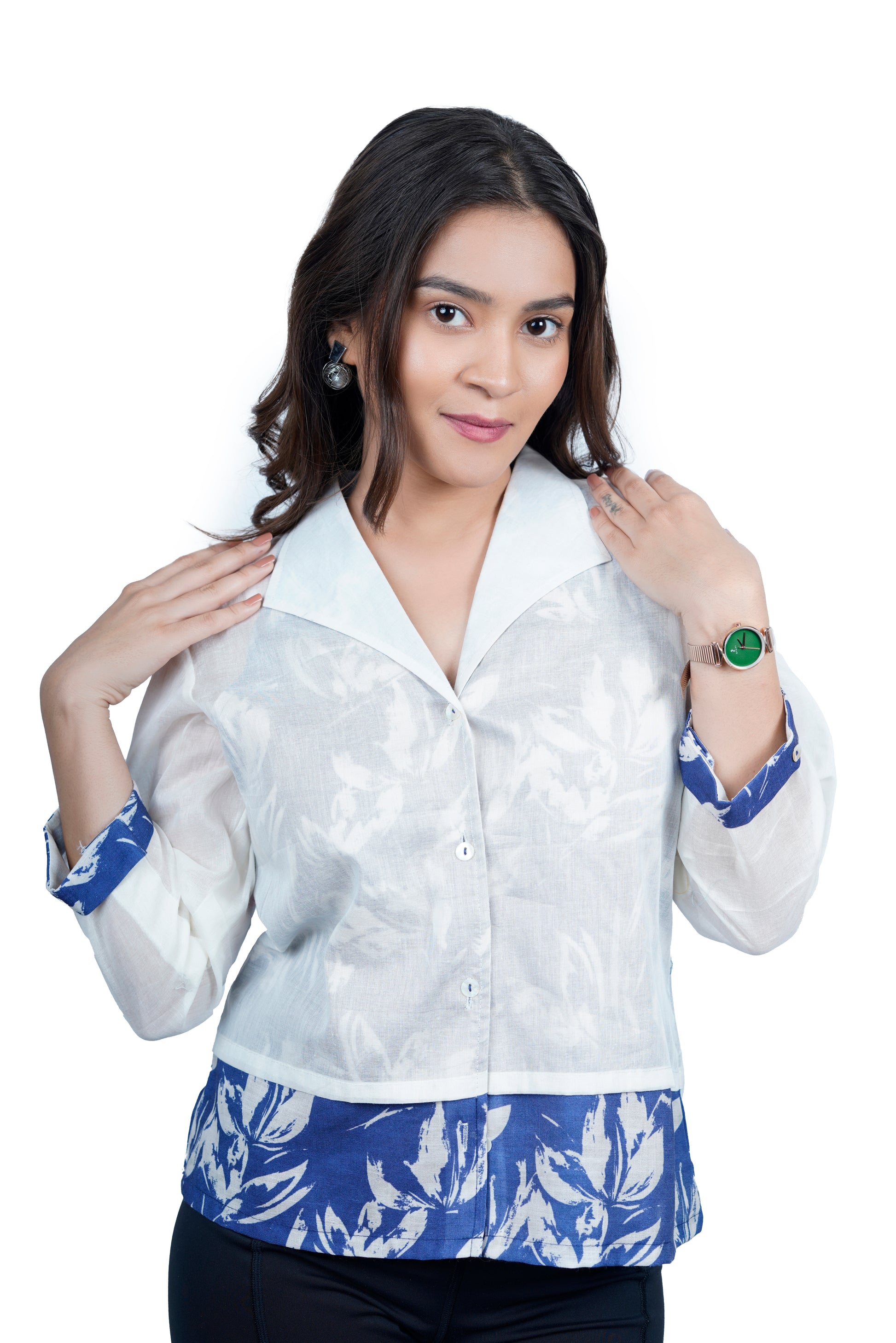 Make a sophisticated statement with this elegant white and blue shirt, designed to add freshness to your wardrobe. Featuring a soft collared neckline and button-down front, the shirt stands out with its floral-printed cuffs and hemline for a stylish contrast. The lightweight fabric and relaxed fit make it perfect for office wear or casual outings. Pair it with trousers or denim for a polished, modern look.